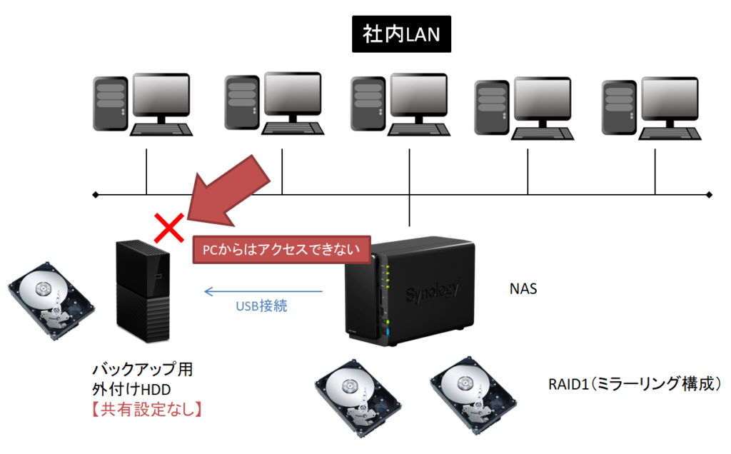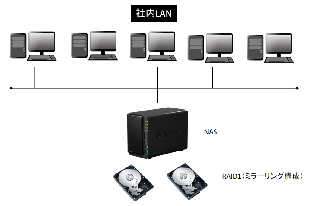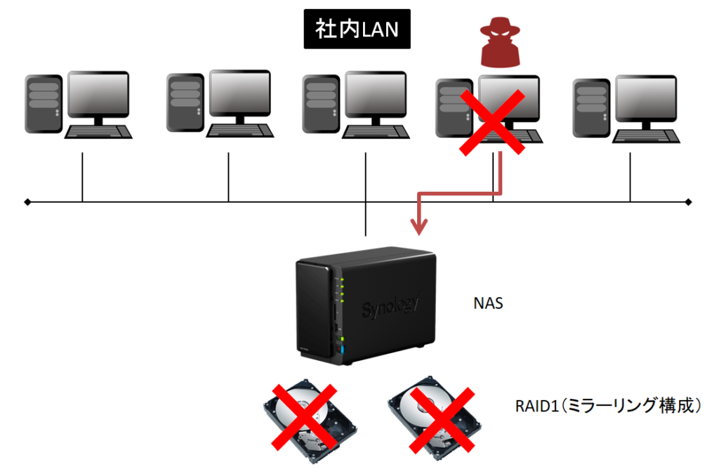 本題です。まず、ランサムウェアに脆弱な社内LAN環境を以下のように想定します。一般的なHDD2台構成のNASが1台だけ存在する想定です。恐るべきことに、危機意識の低い部門単位のNASなどでは、このような貧弱なファイル運用が平然と行われているのが現実です。