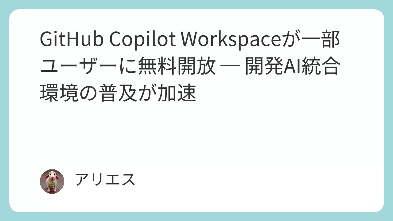 GitHub Copilot Workspaceが一部ユーザーに無料開放 ─ 開発AI統合環境の普及が加速 TECH 2025.10.20 GitHubが、AI開発環境「Copilot Workspace」の機能を制限付きで無料開放し始めたことが複数ユーザーから報告された。Copilotによる設計・対話・コード生成を一体化する環境が、より広い層に試用可能となった形だ。(※現時点では段階的な開放であり、正式リリースではない)