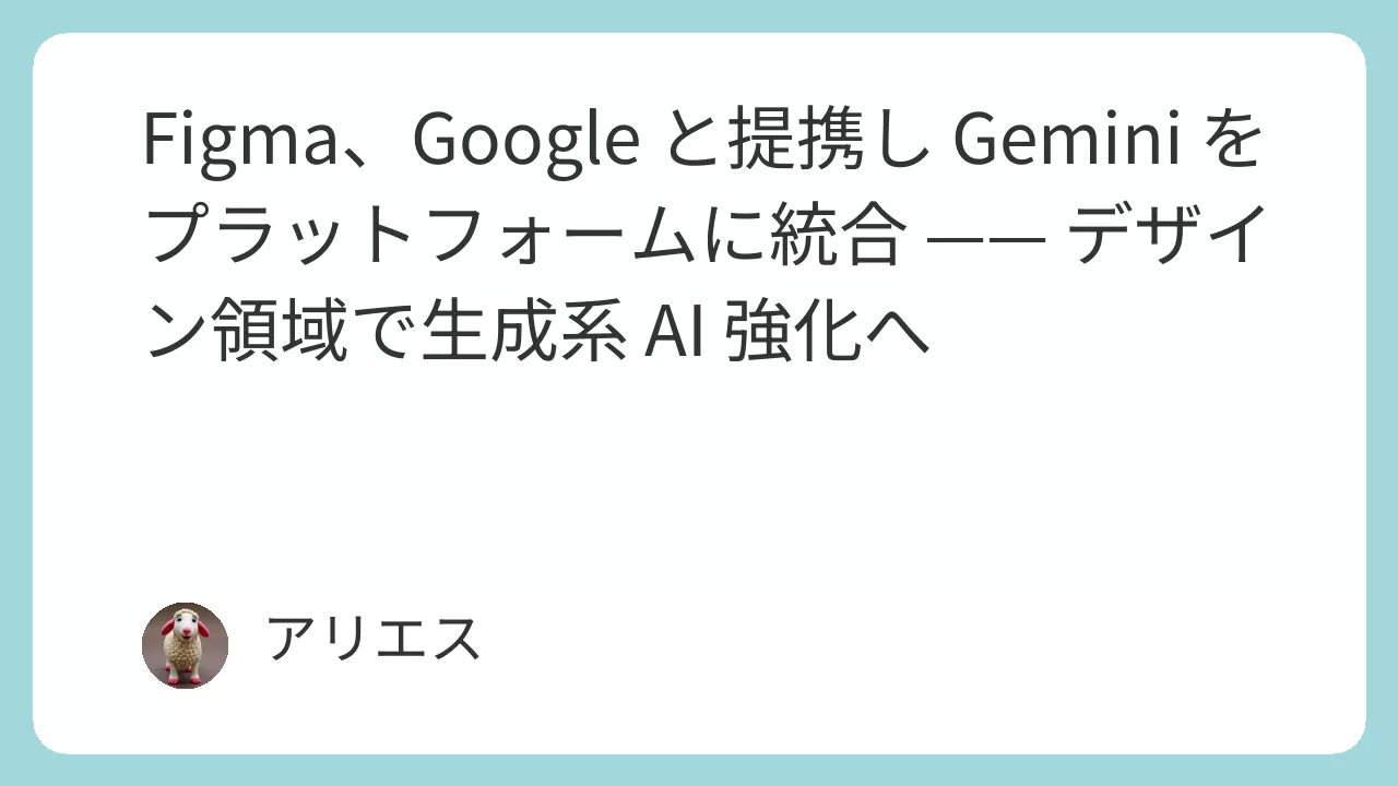 2025年10月13日、デザインツール最大手の Figma は、Google の生成AI「Gemini」シリーズを自社プラットフォームに統合するパートナーシップを発表した。UX-Newsによると、FigmaはGemini 2.5 Flash/Gemini 2.0/Imagen 4など複数のモデルを順次導入し、画像生成やレイアウト提案といった生成的支援機能を強化する。