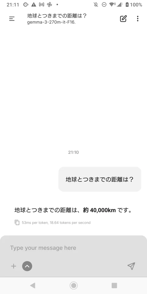 動作中、画面下部には 「53ms/token、約18.6 token/sec」 という数値が表示されました。これは古いXperiaにしては驚異的で、短文応答であれば 1秒以内に返答が返ってくるレベル。