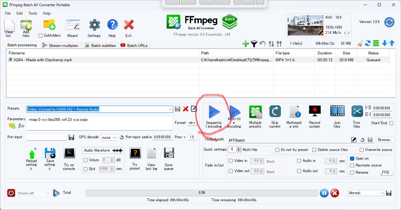 最後に、画面真ん中の右▶ [ Sequential encoding ] というボタンをクリックします。エンコード中は下のプログレスバーで進行状況をチェックできるので安心です。
