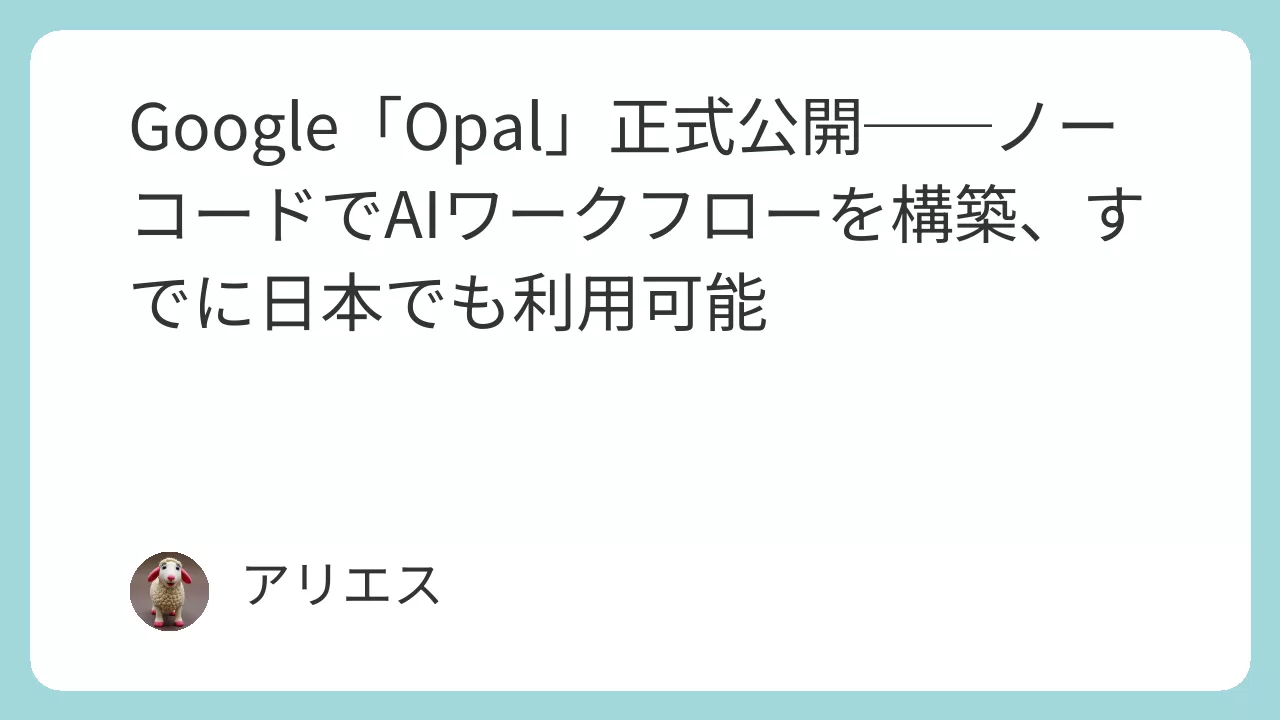 Googleは、ノーコードでAIアプリや自動化ワークフローを作成できる新サービス「Opal」を正式に公開した。公式サイト(opal.withgoogle.com)から、Googleアカウントでログインすればすぐに利用を開始できる。