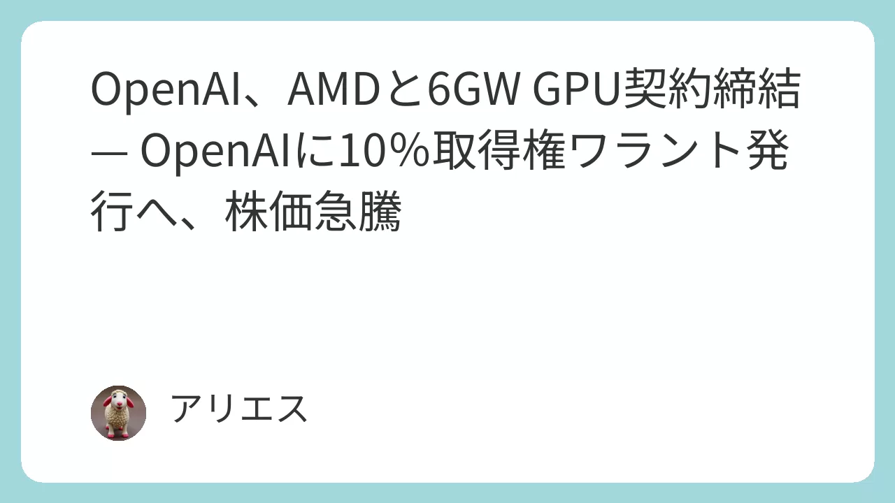 この発表は、AI業界におけるGPUサプライチェーンの再編を象徴する出来事となった。OpenAIがNVIDIA、AMD両陣営と並行して連携を進めるなか、次世代AIモデルのトレーニング基盤がどのように構築されていくのかが、今後の焦点となる。