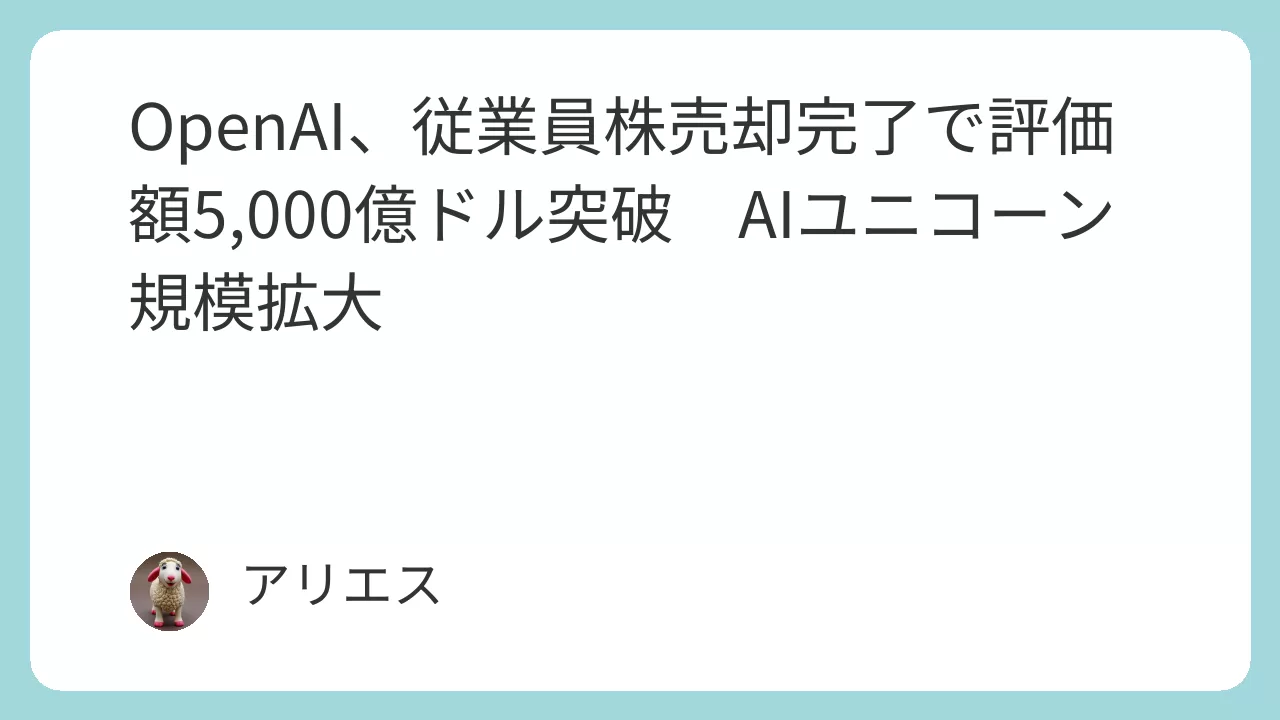 OpenAIは、現役および元社員による株式売却を通じて約66億ドルを動かし、その結果として同社の評価額が5,000億ドルに達したと報じられた。これにより、OpenAIは非上場スタートアップとしては最大級の規模に浮上している。