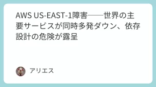 TECH AWS US-EAST-1障害──世界の主要サービスが同時多発ダウン、依存設計の危険が露呈 AWSの基幹リージョンUS-EAST-1で大規模障害。PerplexityやSnapchatなど世界的サービスが同時多発的にダウン。クラウド依存設計の危険性が浮き彫りに。 2025.10.20 TECH