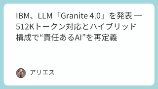TECH IBM、LLM「Granite 4.0」を発表 ─ 512Kトークン対応とハイブリッド構成で“責任あるAI”を再定義 IBMが次世代基盤モデル「Granite 4.0」を発表。最大512Kトークン対応、Mamba×Transformer構成による高効率化、そして署名付きモデル+ISO 42001認証で信頼性を担保。性能競争の渦中で、“責任あるAI”の方向性を明確に示した。 2025.10.06 TECH
