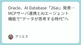 OracleがAI Database「26ai」を発表。MCPサーバ対応やAIエージェント機能を統合し、SQL Firewallや量子耐性暗号で安全性も強化。AIとデータが融合する“思考するデータベース”の幕開け。