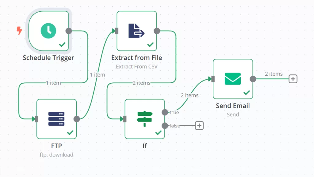 FTP (Download) → Extract (CSV→JSON) → Function (last_sent更新)